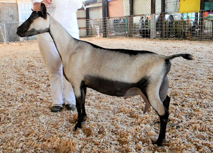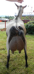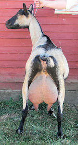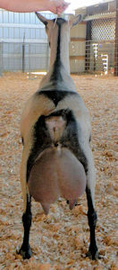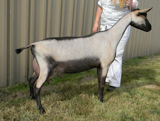 0000I've had several Oberhasli breeders approach me about buying Elite and I'm sure you can see why! Elite is eye catching in her style and correctness in general appearance. She has a wide square rump which is extremely flat from thurl to thurl. She has short, strong pasterns, good angle to the hock, and a high tight shoulder assembly. In limited showing she has already been best in show once and loves the show ring! Elite is proving to be a very valuable brood doe with one Grand Champion daughter already (YBNVS Exige Ewok). We're repeating the breeding this fall.