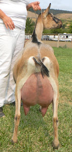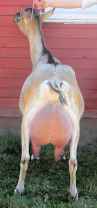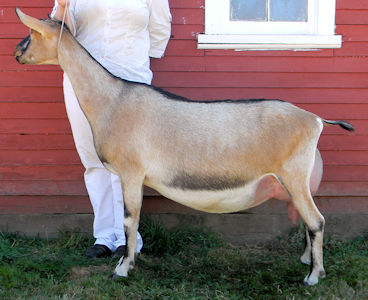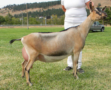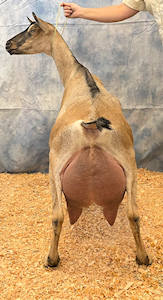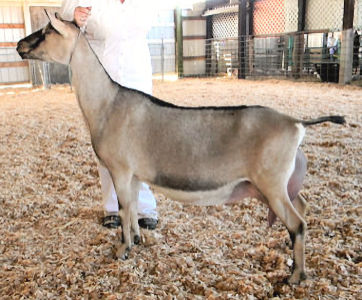 0000Ewok is the largest doe in the herd! She is extremely long and very uphill in the front end with high tight withers. She is wide and powerful all while maintaining her graceful femininity. Her forelegs are straight and true and she has lots of natural width between her hocks and an almost ideal rear leg set. Her mammary is high and wide in the rear with a nicely extended fore udder and good teat placement. Ewok has only been shown four times as milker but already finished her championship and even has a Best in Show win!