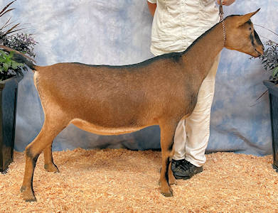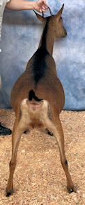 0000Kisaki may not be as graceful as some of my other does, but she more than makes up for it with her correctness in general appearance, strength and power. She has a lot of bone with straight fore legs, a long level topline and a high wide escutcheon with lot of natural width between her hocks.