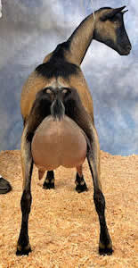 0000Munich may not be as long and tall as Leia or Limerick (my two other yearling milkers) but wow what an amazing mammary! A beautifully extended fore udder, very high and wide rear udder with a pleasing U shape and well-placed small teats. Munich milks so much and is so capacious that she just needs some more time for her body to catch up.